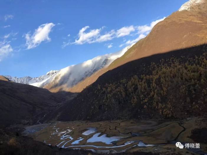 到森林尽头,豁然开朗,一片草甸置于高山暗针叶林和雪山的环抱中。这就是木骡子。坐下来喝一杯热咖啡,看看雪山和云,该多舒服。可惜去年在这儿有惨痛的回忆,此刻只想打了卡就走。太着急离开,跨出围栏时被门槛绊了一下,正面朝下直接扑街,紧跟身后的男选手惊呆。“没事……你先走。”努力抬起头,挥挥手。