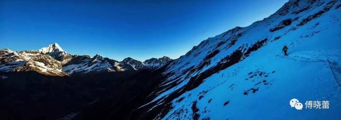 通常过了比赛的最高点就是过了最难点,在UTMS,这是错觉。八角棚海之后山坡上一段大约5公里长的横切,积雪盖过鞋面,没雪的路面乱石如削。深一脚浅一脚地走着,前后有人摔倒,有人断杖。今年暴露感强的路段都安了路绳,身边不时传来救援人员的提醒声。试着轻轻地跑过去,就势滑过去。不要怕,对自己说,摔了也不会死。