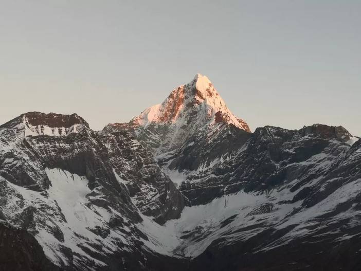 还好心态不错,一开始狼狈不堪,后来引以为乐。走过一大段横切路段,开始正面幺妹峰的时候,竟然还能掏出手机来拍几张日照金山。再往前横切,接近花海子的时候,还有心思录几段玩雪视频。