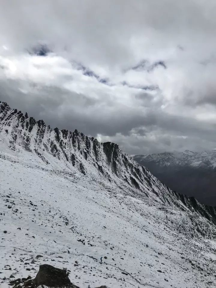 我离你们最近的那次,发生在徒步的第二天。我跟小仓沿着山脊,就是海子沟与长坪沟中间的那条长长的山脊,走到了垭口,又横切到了岔路,左边的那一条便是上大峰的路。那时候天开始飘雪了,我大概有好几年没有见到下雪了,感觉有点冷,却又充满了兴奋。我们循着上山的路一直走到了海拔4200米的大峰大本营,哪里其实只是一圈平房,我们托了屋里一位大爷的福,烤了一会火,吃了些干粮。
