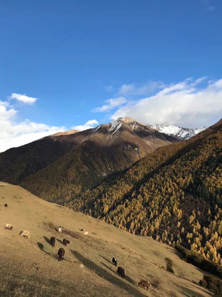 惊喜是在过了打尖包后发生的。最后的一段路,是在山腰间不停地横切,几乎每天都走,但是这一天接近傍晚时分,天气突然放晴了,前所未有的晴朗,弥漫了好几天的乌云消散殆尽,天空显出它湛蓝的本色,残余的几抹灰白色的云,也只敢低低地依附在山头。黄昏的阳光自然是柔和的,轻轻地打在山峦间,铺在斜坡的草地上,把吃草的牦牛们的影子拉得又细又长。大地的颜色好看极了,金黄色的草地,金黄色的山林,跟白色的雪峰和蔚蓝的天空相映成趣。那一刻,我的头疼也好了大半,我便借着等开花的机会,呆呆地坐了好久。