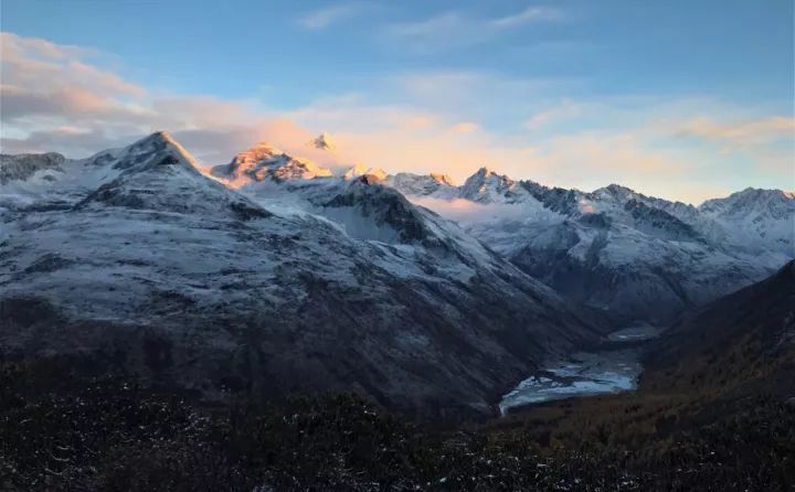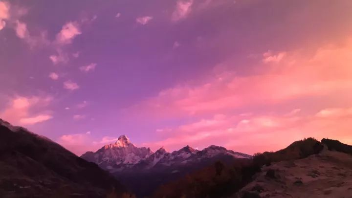 还有你们,我的姑娘们,我是在第四天才真正地看清你们的模样。那天原本是要休息的,习惯性早醒,看到群里说天气晴好,一看时间是早上六点。我迫不及待地拉着我的几位小伙伴,老朱,开花和OP,第四次爬上对面的山坡。还只到半山腰,便看见阳光已经爬上了你们的额头,尤其是高挑的幺妹,峰尖被染成了橘红色,周围萦绕的一层淡淡的朝霞,仿若是她披散开来的秀发。二妹,三妹跟大姊,却只微微露个头,头顶微微点亮了一抹红,定然是为了衬托幺妹的美而收敛了自己。