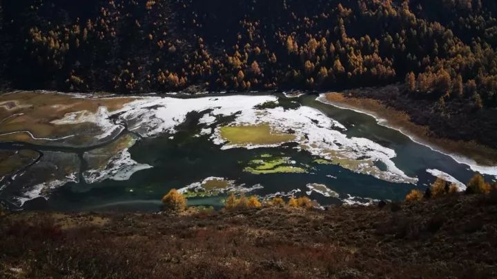 海子沟西侧山坡,霜凝结在灌木和泥土上晶莹泛白,直到太阳从云的彼端升起,暖暖的光线染红了坚硬冷酷的雪山群,整个世界都在日照金山,幺妹峰海拔6250米金字塔般的山尖在崇山峻岭间矗立,而脚下的花海子像是上帝在杜鹃林和草甸之间打翻了一瓶绿色的墨水,这样的赛道风光,真的是天地有大美而不言。