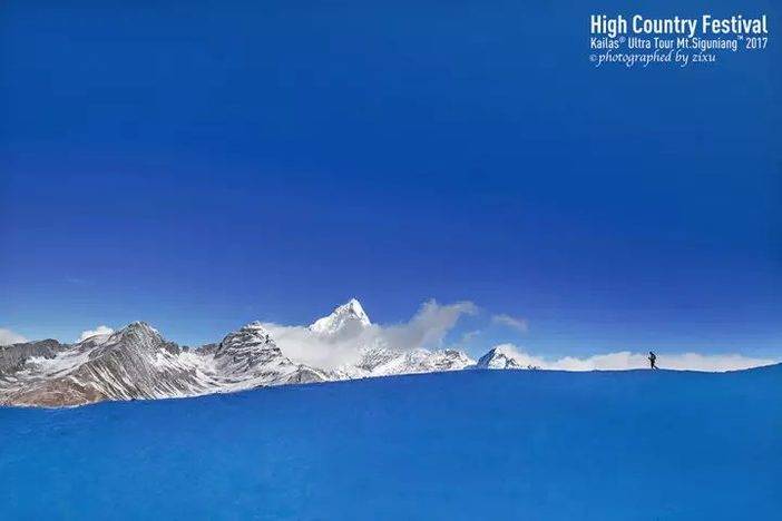 海子沟翻到长坪沟的垭口,altra中国总代理赵凡远远跟我打招呼,见到熟人的感觉真好,他告诉我现在是60km组的第三名,而另一个伙伴也是赛事官方摄影师金晋早已端好70-200mm的长焦镜头虚席以待,这是整场比赛最最完美的拍摄角度,背景是幺妹峰几乎触手可及的巨大山壁,而我奔跑在山脊之上。