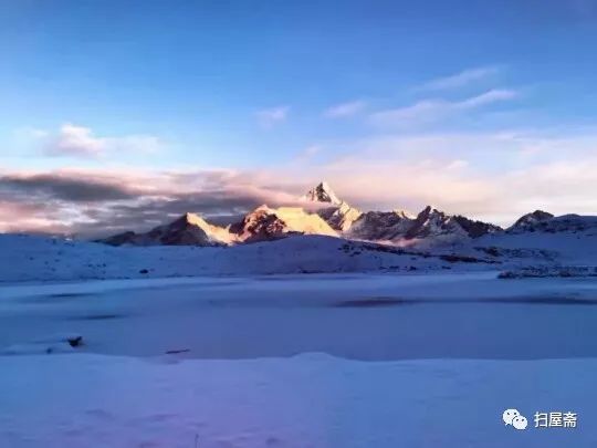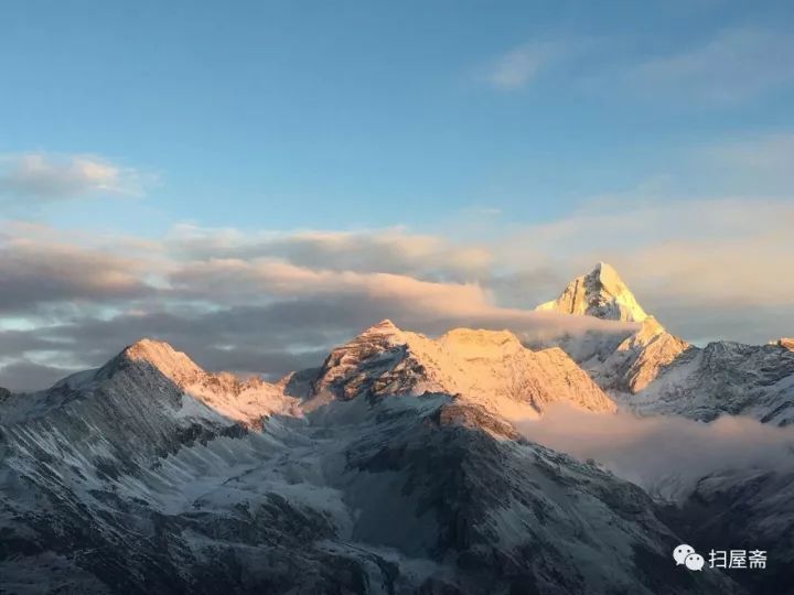 整个海子沟尽收眼底。从沟底往上,黛蓝色的山峦、苍绿色的森林、撒上泾渭分明的积雪,磅礴绵延而去。四姑娘山,四位美女的姑娘,沐浴这晨光,静静的矗立,静静地望着我。特别是幺妹妹,身姿曼妙,洁白无瑕,晨曦照耀,金光炸裂。尖尖之上,有层云雾萦绕,仿佛四妹妹的绝美面纱。源源不雾气,从沟底升起,仿佛什么在燃烧。那一定是圣洁的福气,腾达天路,直逼云霄。那种淡雅的壮观,那种柔软的震撼,让你不得不赞美这大自然所昭示给人类什么是生命最本真的真谛:安宁,静谧,蓬勃而充满无限生机。