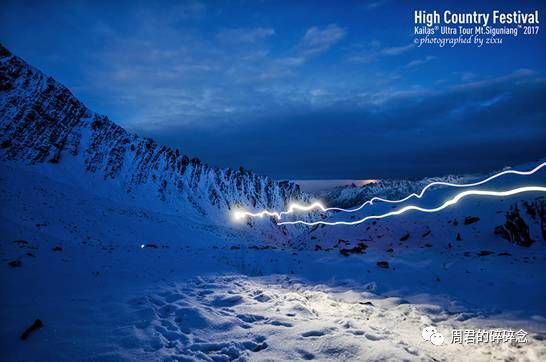 上了马道,我开始奔跑,身心融入山野,享受越野的快乐,到木骡子时,我从58名一直追到17名,当然,那时我根本不知道什么名次,我只知道全程无休,不停的走。补给点我最多的只停不到两分钟,喝了一点红糖水,一块桃酥。当在沟里不断前行,天光不断的亮起来,雪山在我眼前分明,我的心里万般自豪,看着幺妹被金色的阳光照耀,目光移到二峰,想起自己曾到二峰顶这样的高度,信心和力量倍增。