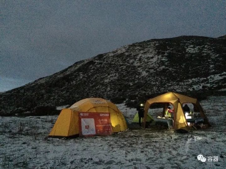 累翻,我没带手表猜着自己心率大概快200,一直向上一直向上的山路不知道要走多久,虽然知道一定有尽头一定有终点,但还是在漫天飞雪中觉得心烦气燥,一步一步挪向那个叫小牛场的CP(Check Point)点。好在,一个看起来糙糙的伙伴,细心地跟在我后面,不断的教我上山的方法,小步走、不要停、每一步把大腿绷直等等等等,重点不是这些话,是他一直用我缓慢的速度跟在我后面,尽管在我们到达之后,他还有近二十公里的路要走。就这样,在某一次抬头,眼中圆圆的黄色帐顶,宣告我爬升的结束。