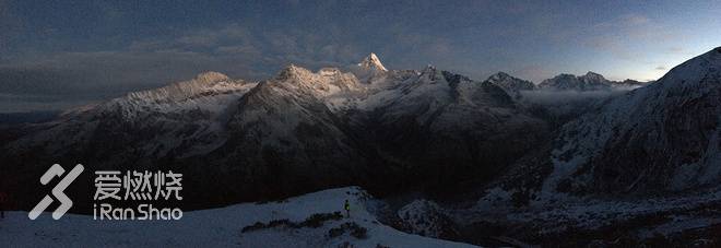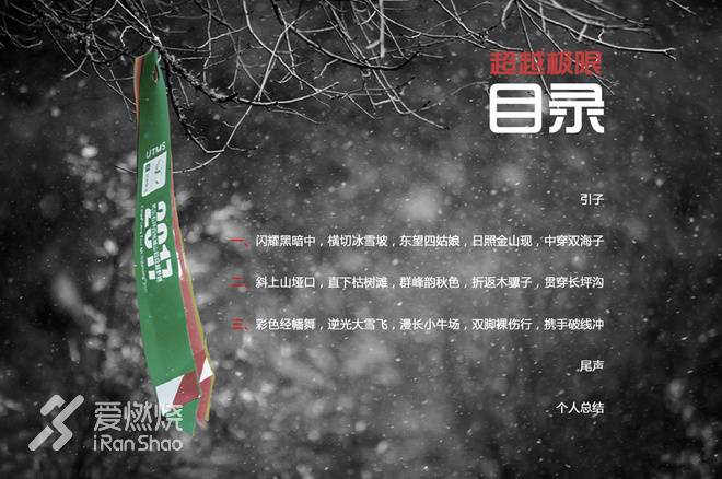 一、闪耀黑暗中,横切冰雪坡,东望四姑娘,日照金山现,中穿双海子(游客中心海子沟山门(