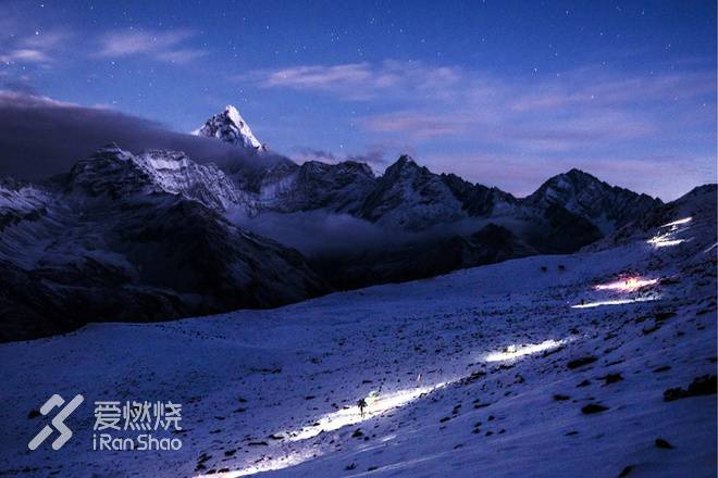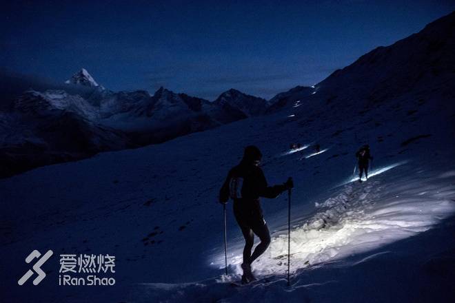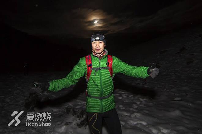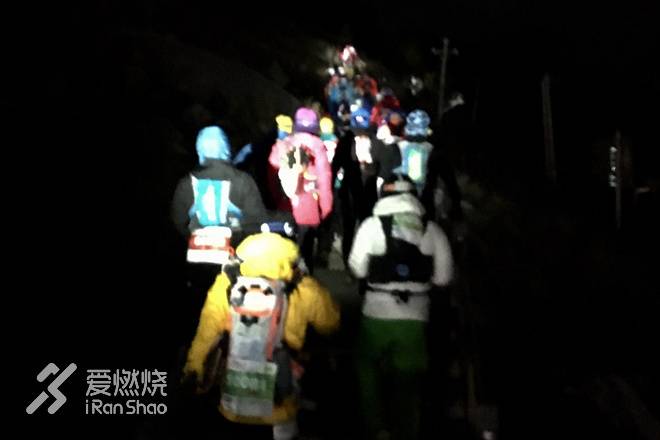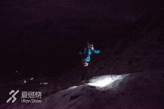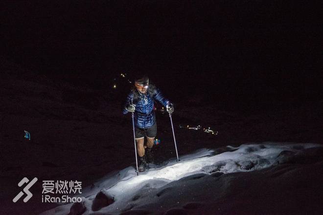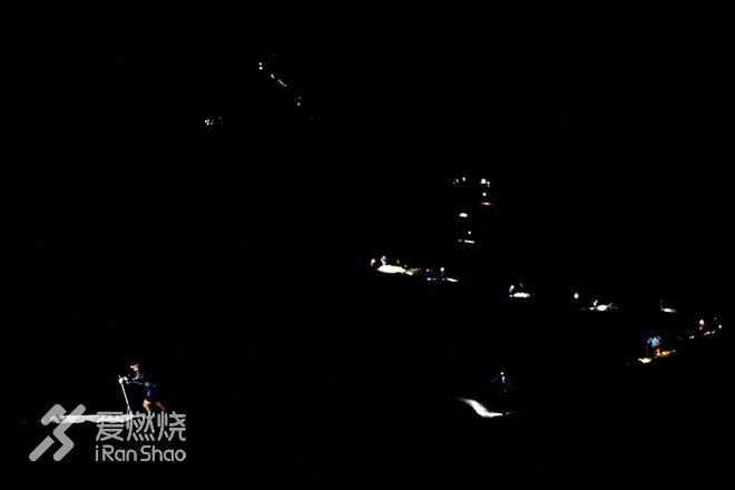渐渐地眼下出现了冰岩混合的路况,这时已经不见Meredith Edwards的踪影了,之后我也再也没能赶上她,不过在去往木骡子的路上遇到折返的她,那时我们差距5公里左右,最终她也绝对优势获得了60公里女子组冠军,真是名不虚传啊。越往上冰雪覆盖越大,我也爬升的越来越吃力,前方的光影越来越远,而后面本来很远的光影离我越来越近,但是我的双脚感觉已经没力加快速度了,不知道是消耗太大还是双脚变得冰冷了,这时后方了一名队员赶上了我,我让他先走,接着跟着他向前,后方的几名队员也在努力的爬着这费劲的雪坡路段。