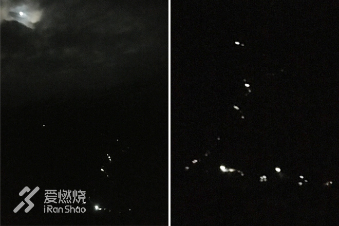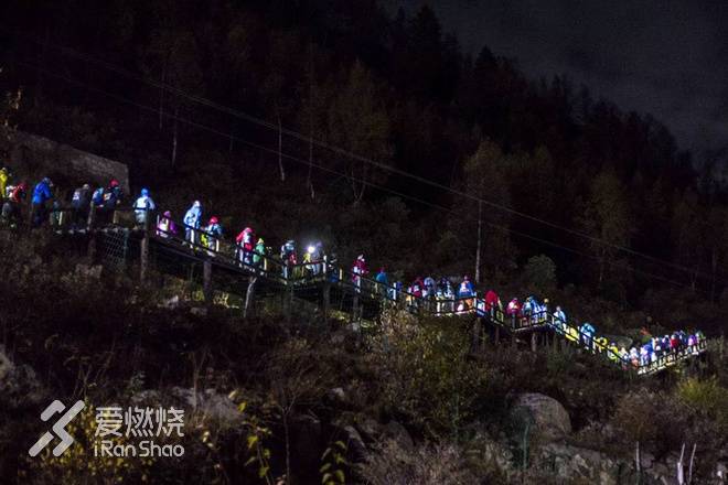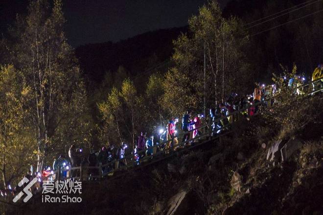 当我到达老牛园子时候,引导员叫我加油说我是60公里前5个叫我加油,我开始朝右下方跑去并跨过一座小桥来到对面的山脚,一段草地路后开始进入树林中向上爬升。随着道路越来越陡,我感觉到双脚越来越乏力,身后相隔2百多米的光影离我越来越近,不久后我的背包被拍了一下,原来是美国越野跑女神Meredith Edwards 赶了上来,之前在石板热的时候我还跟着她跑了一段后来加快速度超过了她,此时她双手支着登山杖快速的朝上方爬升,我只好用双手撑着膝盖较快脚步,尽量跟着她后面,后方的队员还不见踪影,很快我们穿出了森林后是一段曲折的石草坡路,爬升了一大段后,我感觉到双脚有些乏力了,爬一段停一下又接着爬,我与Meredith Edwards的距离也渐渐拉大了,这时差不多凌晨5点钟了,我回头望去,只见身下闪耀着跃动的光点串联成一条长龙般的光带跨越在海子沟间,与夜空中的一轮明亮的圆月交相辉映,构成这天与地之间神奇的景象。