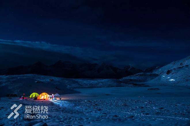 刚出帐篷没几步,我的右脚一抽搐,然后我迅速停下弯腰压住了将要抽筋的脚,直到有所缓解我才继续抬脚慢慢跑起来,这时在我之前出发的两哥们已经离我两三百多米远了,由于天色较暗,我都不知道八角棚海在哪里,后来看官方照片才清楚原来就在我们跑线的左侧静静的躺着,被一层冰雪覆盖着。