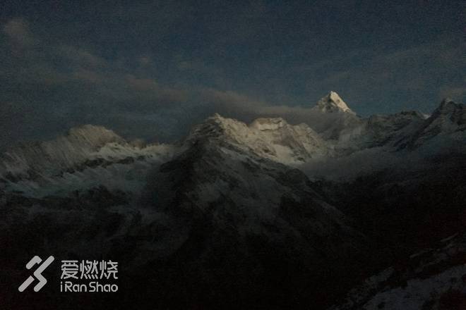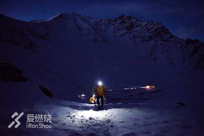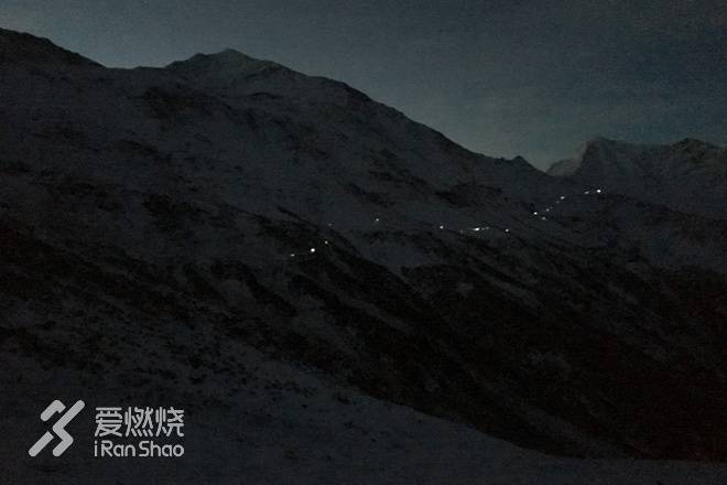 随后脚又恢复了正常状态,我开始加速跑上前方的一段小缓雪坡,这时只见眼前零星的灯光在前方的陡峭的雪坡中闪烁,从这里开始了今天赛程中我认为最刺激,最爽快,最危险,最有意思,最美丽的一段长达三四公里冰坡横切赛道。也许是我自己非常适应和擅长这样险峻的冰雪路线,或许是在这样大美的四姑娘山的陪伴下我异常的兴奋,我跳跃着滑动着脚下的路,差不多横切了一半的时候我赶上了在我前面的几名队员,并按着自己的节奏继续向前快速前进。当我跑下一段较大的雪坡后,回头望去,整个山腰上被我们头灯划出一道最耀眼的风景线,那是一个个鲜活生命创造出来的震撼场景。而在我的对面四姑娘山也渐渐苏醒露出她靓丽的容颜,我置身在这美妙的冰雪世界之中无比的享受。随后几个队员也跟了上来,我们一起继续向前行进了一刻钟左右,前面2位在冰雪中烤着火的引导救援人员指引着我们朝右上方一点后就要下撤了,也宣告了这段荡气回肠的横切路段的落幕。