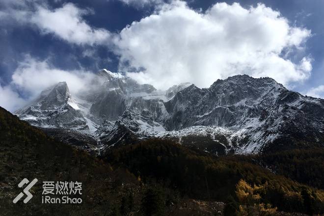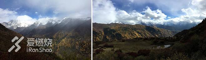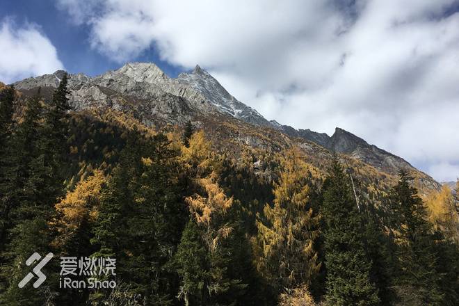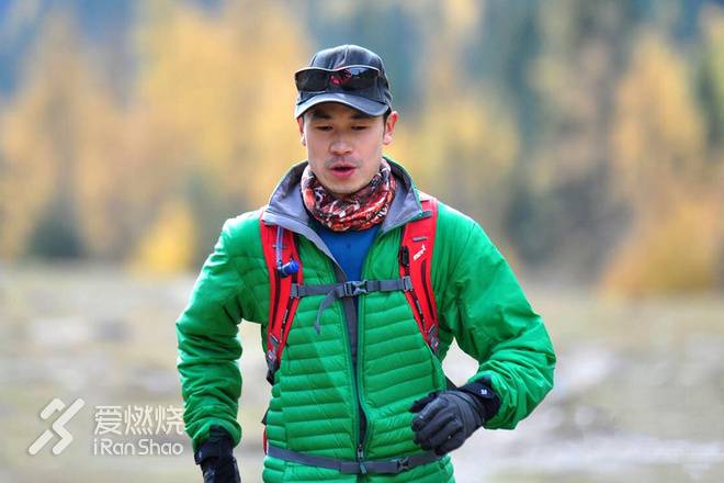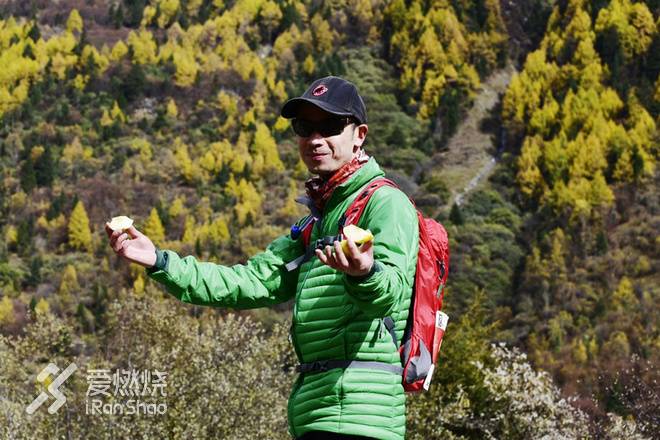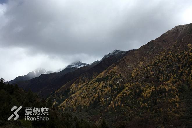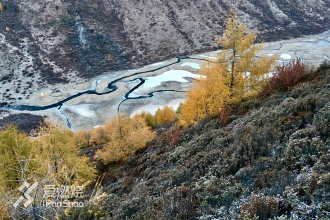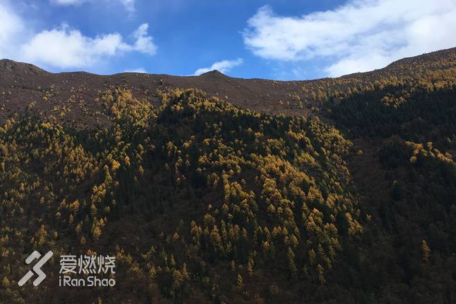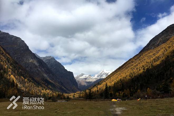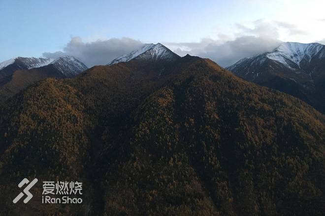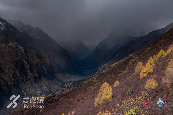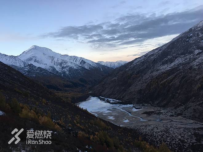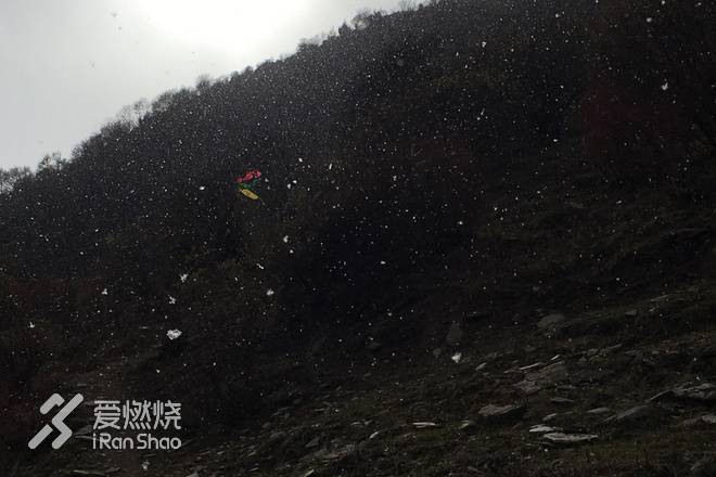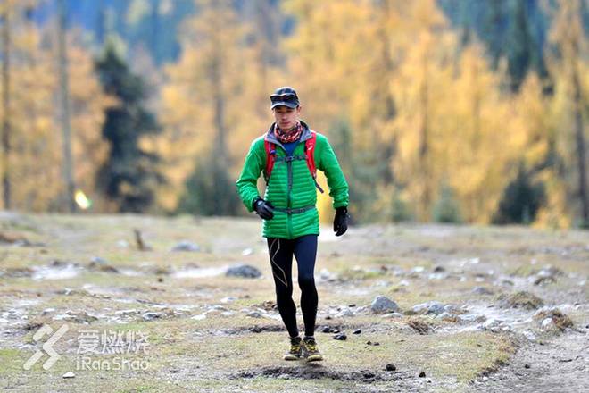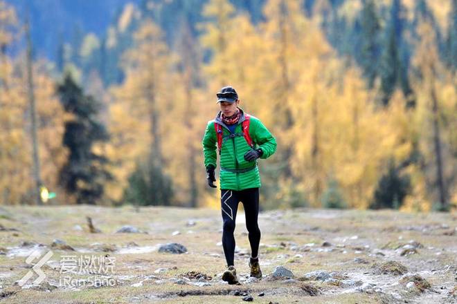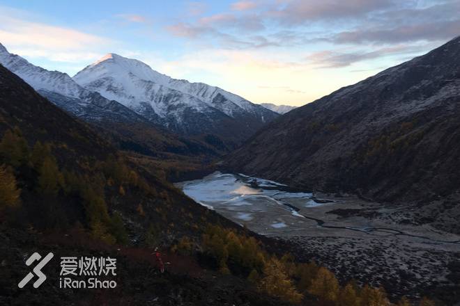 两三分钟后我不舍的转身朝右侧的陡峭的雪坡开始下降了,大概20分钟后我一路下撤至下方草坡平台边缘,此时眼下出现了金黄色树林,在下方镶嵌着大海子和花海子,在花海子端头便是花海子CP3。而在视线的上方缥缈的云层之上,一抹炫目的金色点燃了整个冰冷的天空,我再次被迷住站在原地静静的仰望着这撼动人心的画面。后面几名队员超过我也没有让我动摇,在这里我足足待了5分钟后才继续下撤至花海子补给点。