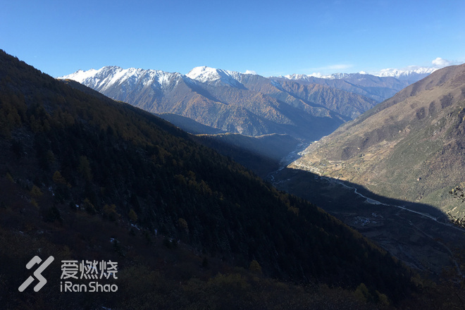 从鸡棚子补给点出发后是一直斜上至山脊垭口处,一路穿过大片的灌木丛后,差不多上午9点半钟我到达了山脊垭口,这时我彻底告别了海子沟来到了另一面的长坪沟区域上方。高耸的金字塔型的幺妹峰南壁成为视觉的焦点,长坪沟对面的高大宽阔的山墙横在眼前,而沟尾的长坪村正在迎接今天第一缕阳光的到来。