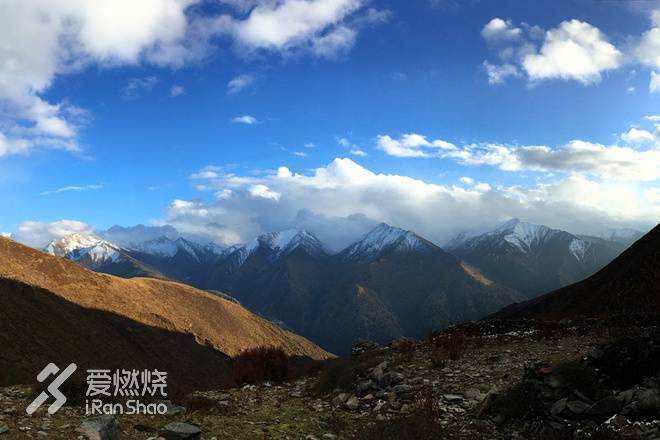 这时,我碰见了之前超过我的明哥,然后我们开始朝山上走去,没走多远,我感觉双脚裸有些不适,应该是之前就有点不大舒服了的,他因为有登山杖上坡比我稍快一点,我叫他先走,我跟着。艰难的爬上喇嘛寺后的大山坡后,是一段向左斜向的不断爬升,此时,四姑娘山以及巴朗山群峰在我的眼前构成一巨幅壮丽的山水画卷,暂时缓解了我的伤痛,继续朝前行进。