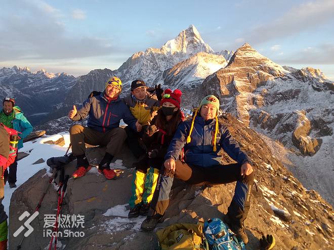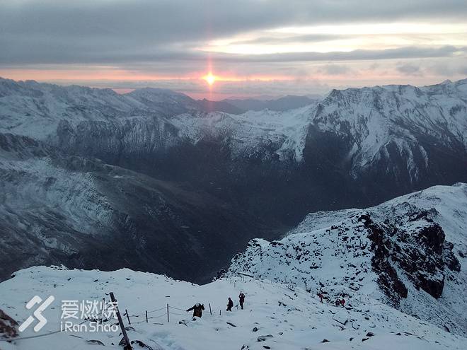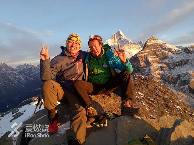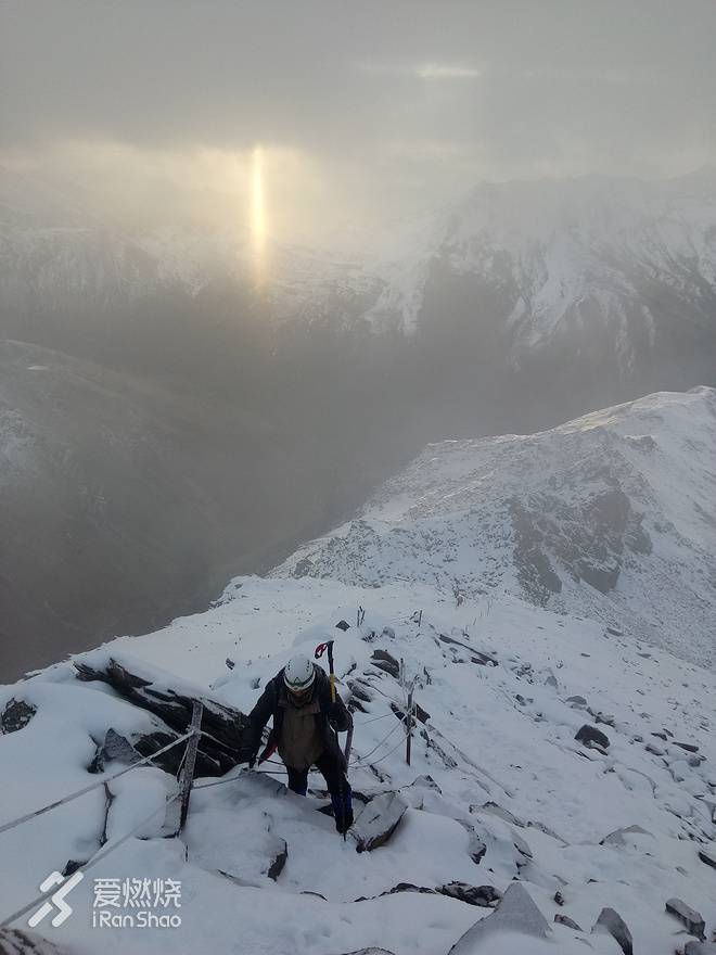 5千米的垭口平台之上,天色微亮,红日从远方的云层中穿透过来,二峰之巅笼罩在白色雪雾之中,沿着固定好的铁栏杆徐徐上升,7点半终于站上二峰之巅。