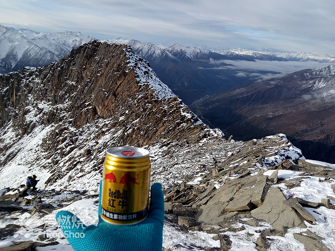 11月2日,凌晨三点起床,该起来的都起来了,两位高反强烈的兄弟卧床休息。吃早餐,灌好热水,还捎带了三瓶红牛,出发前喝了一瓶,另外两瓶一路从大本营背到大峰顶再原封未动地回到大本营,一直处于冰冻状态,直到二峰大本营才解封。