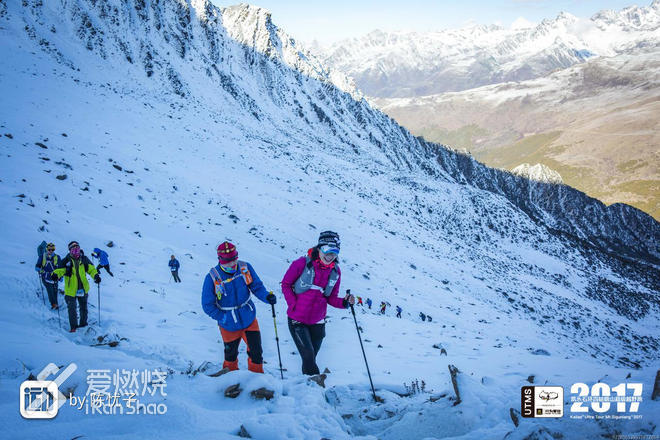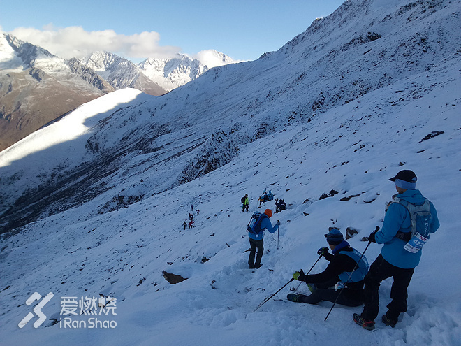 陡直的爬升过程中,小腿肌肉一直在紧张收缩,要命的是体力开始下降,爬个两三步,得撑着登山杖,大口吸着冰冷而新鲜的空气,然后回头看看山坡上紧跟其后的其他跑友,接着再把以上的动作重复做。