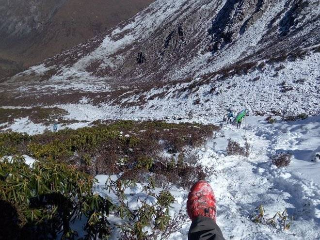 雪后的四姑娘山露出了它的青面獠牙,几百人踩过的雪地线路变得异常湿滑,身旁就是悬崖峭壁,姑娘们要么迈着三寸金莲小步,要么臀部滑雪式,面对眼前的滑雪道,我也选择了臀部滑雪式,顺着山势下滑的过程中,屁股碰到尖石,那种蛋碎的感觉促使我还是采用排山倒海式来的舒服,踩稳落,一路飞奔下山。