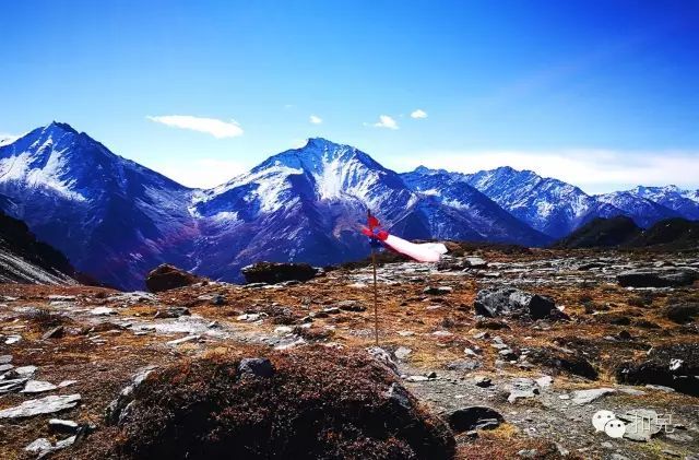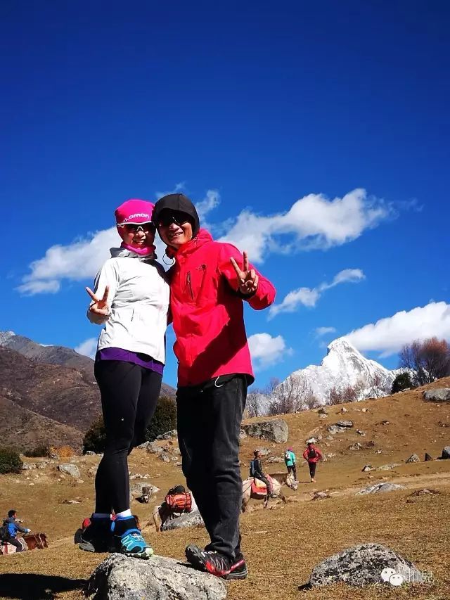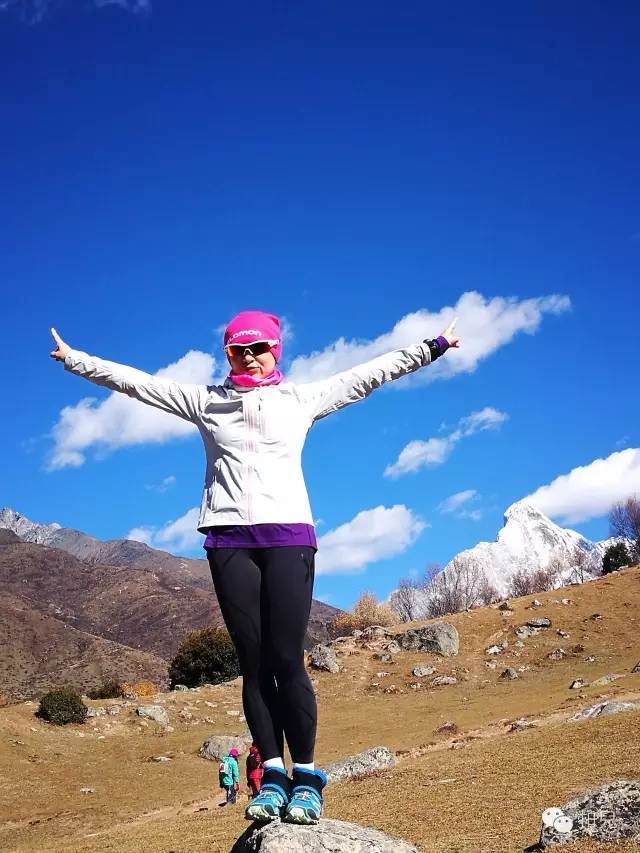 蓝天为幕雪山做景,踩到石头上跟队长来一个!耶!
