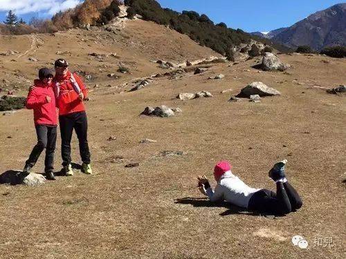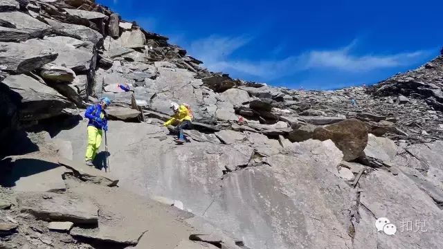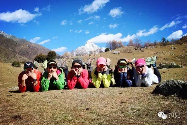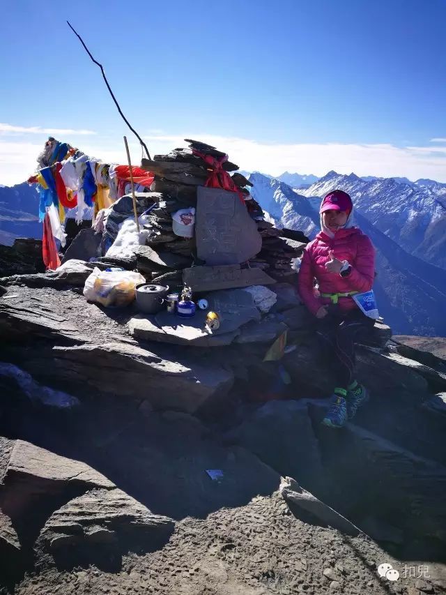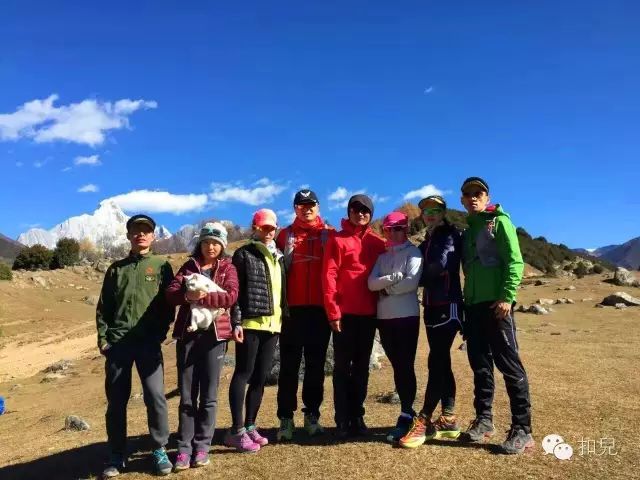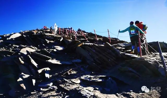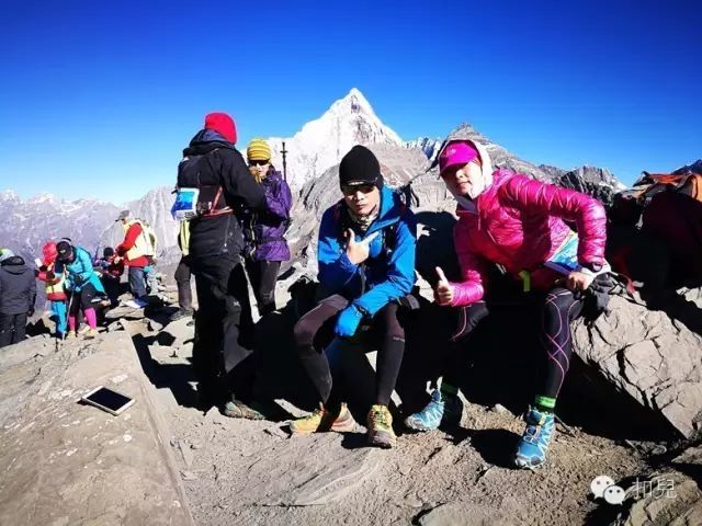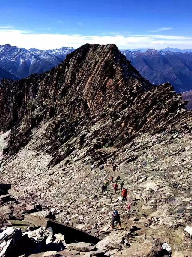 山顶风蒿蒿滴,爬上来的汗以最快速度消失,在没有彻底冻麻木之前,把所有能裹滴都裹紧,只有那么点点大的一块地方,陆陆续续有队员爬拢,两刨三哈换方向互拍、自拍搞完,收拾准备下山。导致完全没有和最牛(今年登顶珠峰)最美志愿者(比我漂亮得多得多)子君(最顶上那个红衣服黄背心的),回来看到微信群里头各种晒,简直腔都开不出来,斗只有各人闭声闭气闷起,说老实话,巨遗憾!
