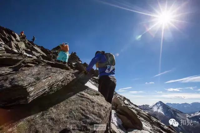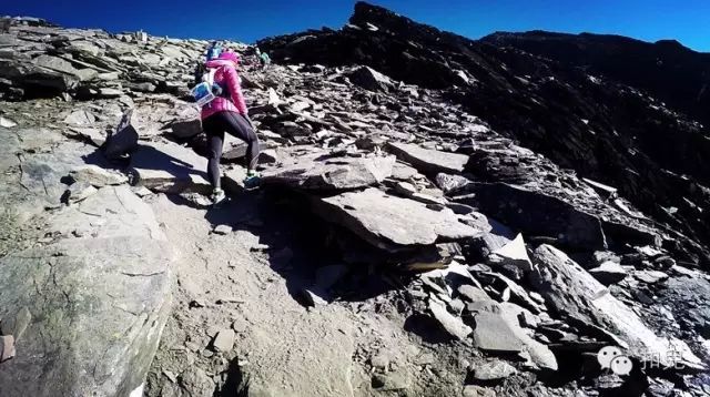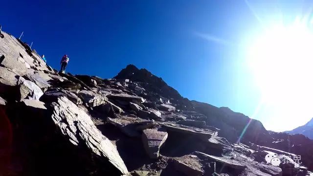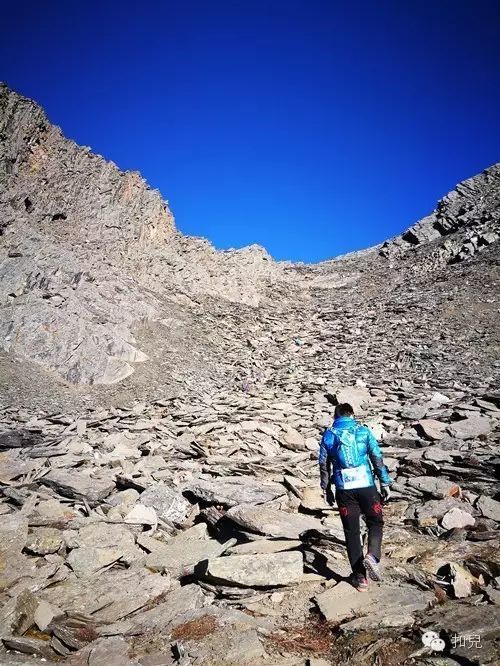 下山路上我收获了无数顶起高反努力往上爬滴羡慕和仰望的目光,没有上升那么辛苦,不能跟大神一样蹦下来,至少我还可以小跑,小心翼翼的跑。心头还是多爽快的,太阳晃得厉害,全副武装遮严实,以安全为主,跳,跑,偶尔遇到松动的石头块块站不稳前前后后的晃就赶紧往后坐,实在不行就一勾子坐地上手撑到碎石板过梭,这个时候手套比手杖好用,看来我这盘背仗又是各人胀笨了。