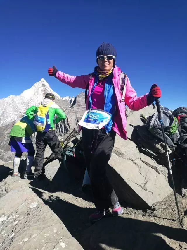 登顶用时2小时,比关门时间12:10提前1小时20分,这下心情放松啦 !峰顶很小,其他人都在前面围着女神拍照。我先帮一位差不多一起登顶的广东帅哥拍了四方格登顶照。退到最后面,把冲锋衣拿出来穿上,补了水及脐,请救援队员帮我拍了登顶照: