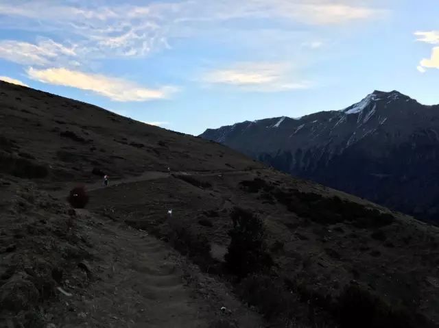 第二赛段,打尖包到大峰大本营,4.1公里,600米爬升。往前看到了鱼哥,很惊讶地发现凌飞就在旁边。天逐渐变亮,已能看清远处延绵的雪山。穿过小段树林后进入到高山草甸。随着海拔抬升,有明显的气喘。第一次看到下撤的选手,身上绑着红色的号码簿。