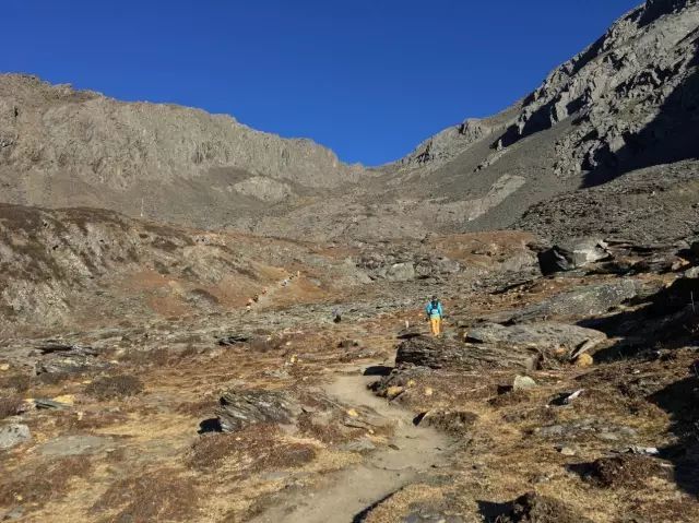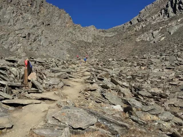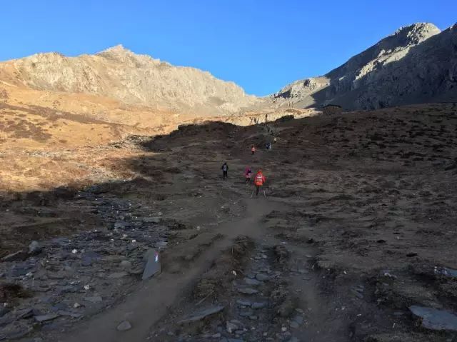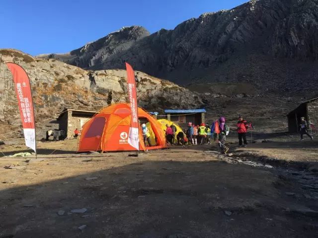 前面出现志愿者指路,提示还有1公里多就是大本营。8点30分抵达大本营,用时1小时50分,海拔4314米。进到帐篷打卡,在旁边的补给点喝了小杯热水。期间有志愿者很高兴地说:“这是第一缕照进大本营的阳光!” 在旁边石头房子的台阶上坐了下来,换上太阳眼镜。出站的时候已经是8点50分。