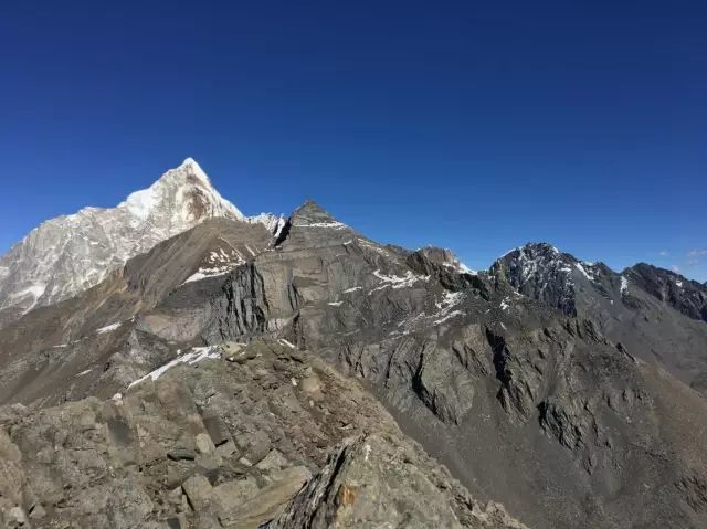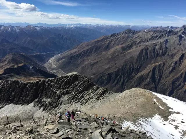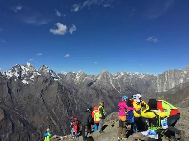 距离大峰顶还剩十几米,已经能看到上面穿着绿马甲的人员,肠胃再次抽搐,比以往更加强烈,扶着石头把胃里剩下的水分都吐了出来,剧痛导致泪水喷涌而出,模糊了视线。这一计时点的志愿者有女子珠峰登山队的子君,在引导下完成打卡和盖章。登顶时间11点30分,用时2小时40分,峰顶海拔5038米,含氧量大约只有海平面的50% 。完成了赛道难度最大的部分,心情也放松了下来,刚一路的痛苦就像没发生过。拍照、合影,伍薇还特意给指出婆缪峰的位置。