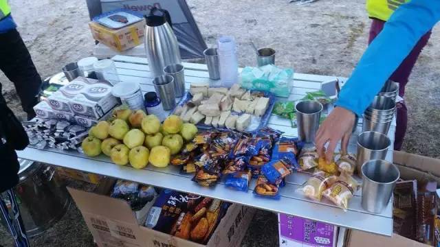 天逐渐变亮,关了头灯,可以看到不远处的雪山,可以看到高山草甸独特风光,可以看到日照金山。顺便捡了个帅哥维达一起上路,一起拍照。一路上气温比较低,所以我不时的吸一口水,防止水被冻住。这段路况比较好。到了这个打卡点我吃足喝够,大补给了才出发的,必须给组委会补剂点个赞,样式多品种全,志愿者服务也特别到位。