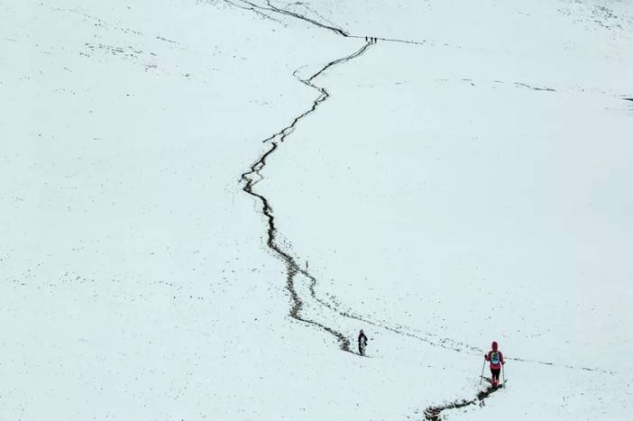 身体的疲惫和无力感侵袭脑海,呼吸无法跟上行走的脚步,这一刻我深刻的感受到了什么是举步维艰,抬头看了一眼雪山,只能看到几十米范围内十几个人,山有多高,我看不到,心中不觉压抑起来,当我第三次抬头时,快要绝望了,什么时候才能到山顶……我不断的给自己打气,不断回想所有能够振奋信心的往事,想起了迟教练在赛前给我说的一句段话,“比赛装备不是最重要的,重要的是身体的基本素质及坚强的意志,在面对雪山恶劣的环境,唯一支撑自己的只有坚强的意志,这是对你意志的考验,能依靠的只有你自己。”轻呼一口气,“这是在考验我的意志吗?好像很有意思,那就看看我的意志极限在哪里!”
