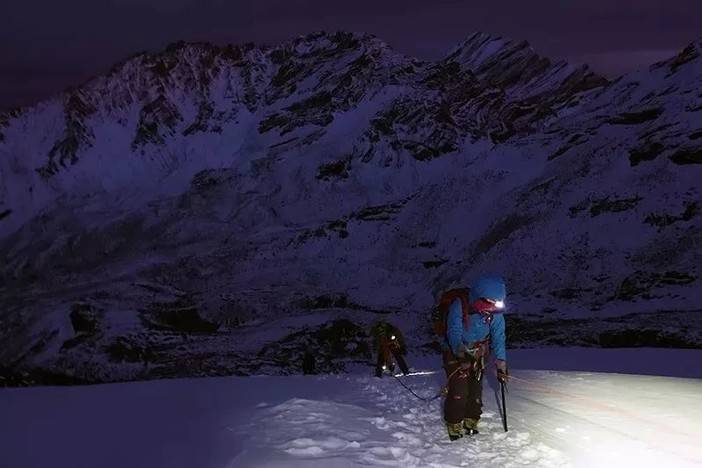 10月4日冲顶路上。2点起来,3点前解决完所有吃喝拉撒穿戴装备的问题,必须准时出发。登顶之前的路段上设了2个CP点,4900米的CP1和5100米的CP2,都有严格的关门时间,谁将与谁结组,将根据到达5100 米CP2的时间而组合。到顶的关门时间12点。
