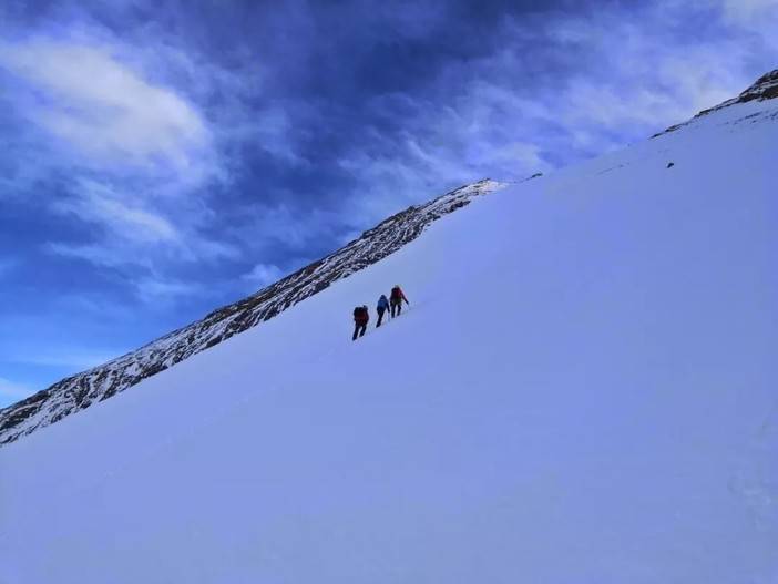 我的速度有点儿慢,雪山上,摄氧能力、攀爬能力都下降了。但体能不能因步频加速而下降,我几次请求大家不要太快或暂时休息一下。时间还挺充足。大家逐渐匹配起合拍的速度。最后这300米爬升累人,在超70度的坡上,我第一次有抽筋打颤的赶脚。