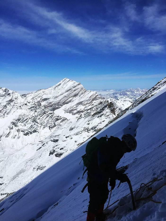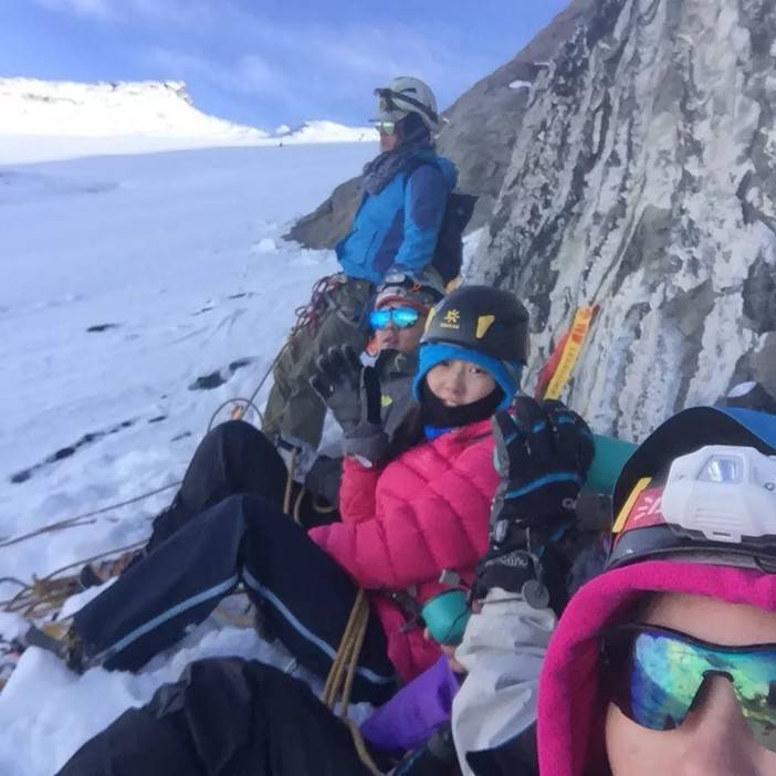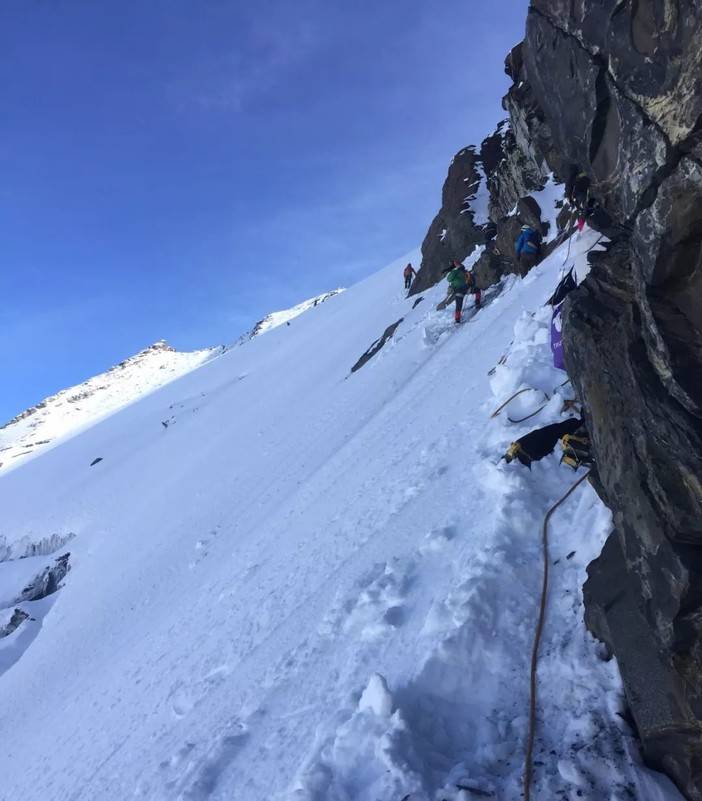 登顶后是原路返回,曾经过的难点并没有因为我们多走一趟而降低难度。因为与上山的第3组绳队相遇,需要错车,又有绳被缠住,第1队登顶的人已在此前的难点上纠结了约莫40分钟。而我们必须在原地等候,后面第4、5、6队的人也无法上来。