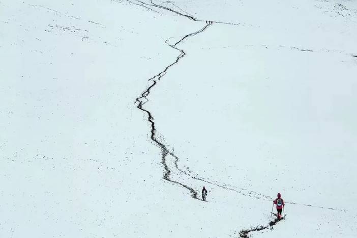人小得就像蚂蚁,投在白色的冰雪画卷上几乎找不着,立起的竹枝上的红色赛道标志就是我们可循的Flag。远处的山体,冷峻,巨大,十足的水墨画,真让人叹息。在路上踩着踩着,鞋底儿就垒起一叠冰渣,有种踩高跷摇摇晃晃的烦心和小快乐,就再到旁边的雪地里踩上几脚,让叠起的冰渣成块地从鞋底脱落。这样的动作,一路上不停的重复。