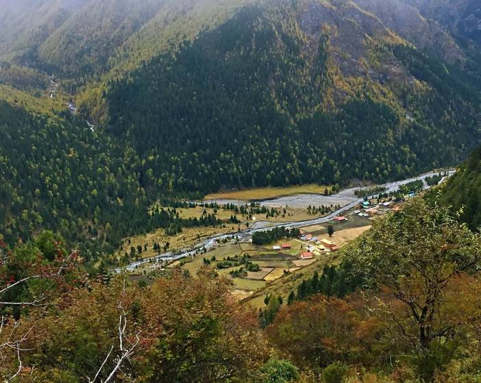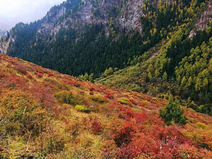 从垭口直下,远离了雪原,川西原野就缓缓展开了秋韵的画卷。今年的黄叶、红叶来得恰到好处,色彩层层叠叠,不像去年,闰,秋的脚步略晚。有小溪谷路段,有原始林路段,沙棘林也金黄了。心里又哼起了歌。前后的人开始轻快的跑起来。我依然保持用杖交替,快速行走。