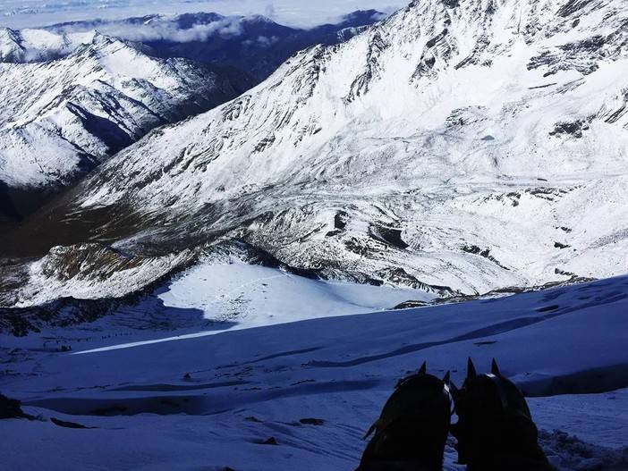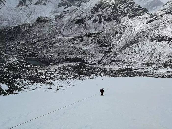 我们也开始下撤。后来听说有人因无法登顶而瞬间爆泪。绳队中最后的我,变成了第一个的我。下脚,挂锚,解锚。动作是一样的,却需更小心翼翼。协作看我们下坡不得劲儿,便又教了我们如何使用冰镐下坡的技巧……