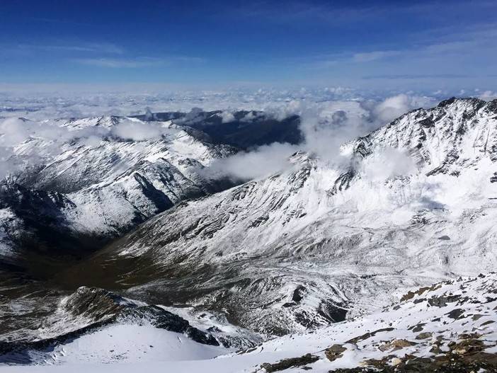 站得高时,上到一个顶峰时,看到的景色和山下、半山腰是完全不同的所在。山峰,山脊,雪坡,是大自然神来之手,看不够的山体形态,看不够的景。