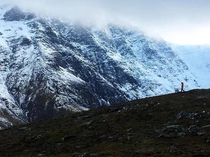 10月2日上山途中。午后变天。从冰川水流经的3900米营地往上是高山草甸,只有一条通往海拔4400大本营的路,开放式行进即可。此处坡度陡升,是村子至大本营13.5公里中的难点,人们边走边停,笑声渐少,喘气如牛,速度、距离逐渐拉开。路边的大石头上结了一串串冰棱子,倒悬着,像戟像剑,煞是好看。等爬上垭口,真正的风的主场到了,风开始呼呼的吹,毛毛雪肆意飘飞起来,高山草甸很快被雪花笼罩,一时间足迹无踪,四野茫茫。