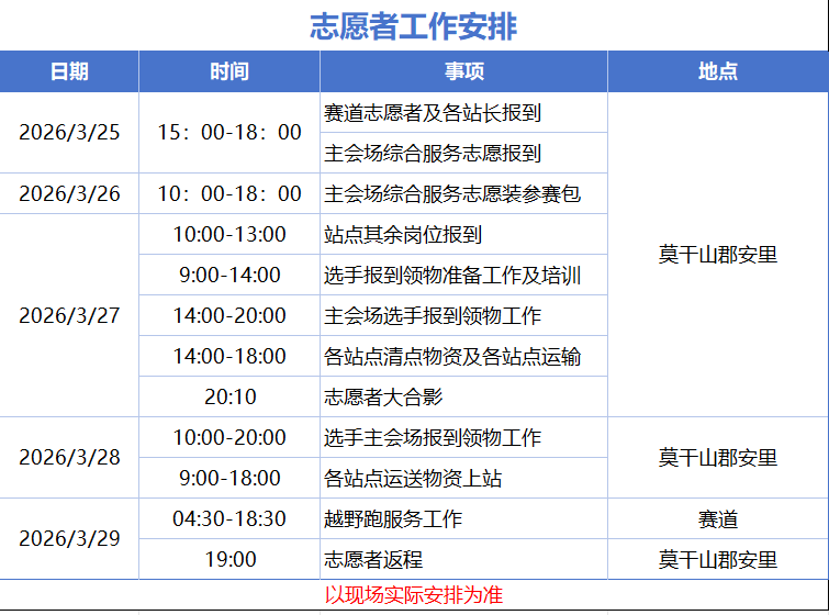 5.非莫干山本地志愿者,赛事期间德清-莫干山的交通往返、住宿、餐食安排;