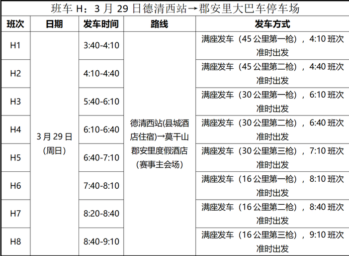 为便利参赛人员,组委会选定【杭州萧山机场】【德清西站】【德清站】【莫干山中心学校】作为接驳站点,于赛事报到日及赛事当日提供交通接驳服务。本次交通接驳服务采用提前预订方式,请各位参赛选手根据自身需求,提前预订相应班次的接驳车辆。班车信息如下: