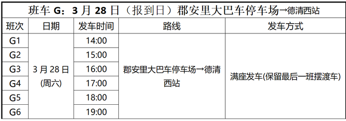 班车G:3月28日郡安里大巴车停车场→德清西站