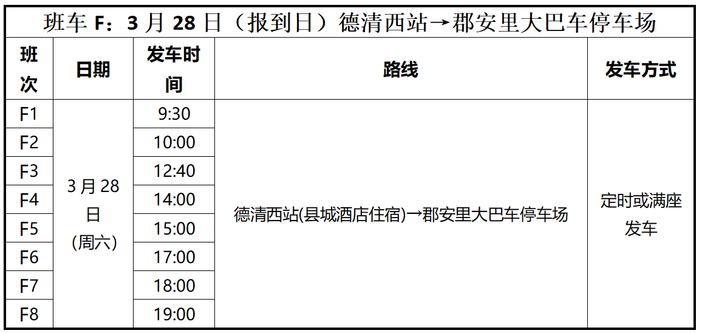 班车F:3月28日(报到日)德清西站→郡安里大巴车停车场