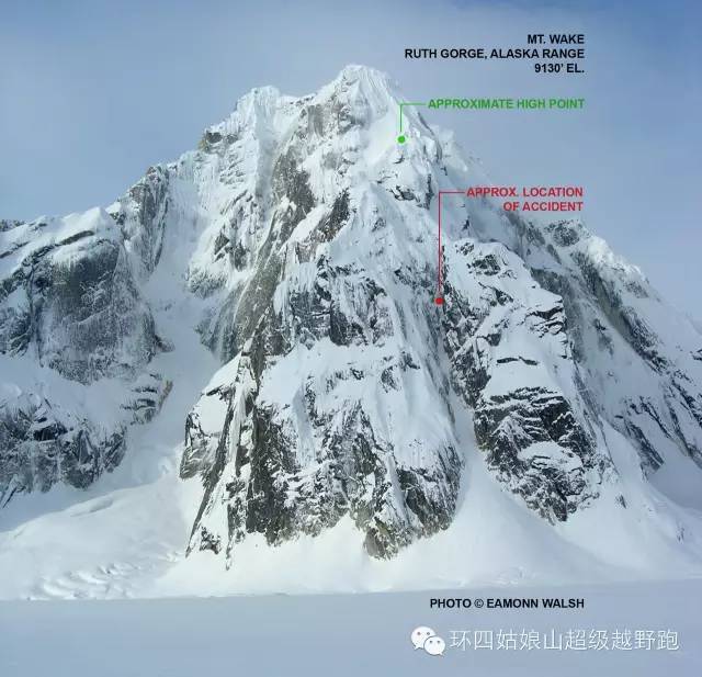 Dylan领攀了快乐牛仔式的两个绳距后,我们终于到达顶峰下的平台。Dylan又领攀了冰塔上的路线,我来爬云雾中的最后一段。我发现脚下的岩石已经从花岗岩变成了页岩。云雾之中很难判定哪里是最高处。忽然云开雾散,我们分明看到30米开外就是金字塔形的山顶。我爬上最后一道优美的雪檐口登上顶峰,很快Dylan也到了。他帮我把Lara的骨灰撒在顶峰上以示对她的纪念,然后我们开始下撤。