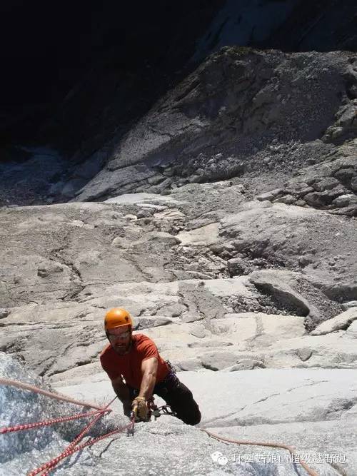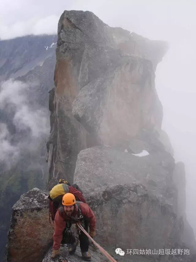 第四天一早的目标就是第十五个绳距,我把最后一点水留给了Dylan让他去开路。上升了三个绳距之后终于上到了刃脊,不过时间也到了下午。我们重新打点装备,背上了35公斤的背包,开始了刃脊上的攀登,同时希望能找到雪以解决喝水的问题,我们已经断水36小时了。爬了一段后,我发现背阴面有一个很深的凹槽里面有厚厚的雪。我们停下拉花了好几个小时补充能量,吃一些热餐。傍晚时我们在两个突出的岩石之间扎下营来。这时候变天了,乌云拢上山脊。把岩石都罩在薄雾里面。幸亏我们上来得早,再晚几个小时就麻烦大了。