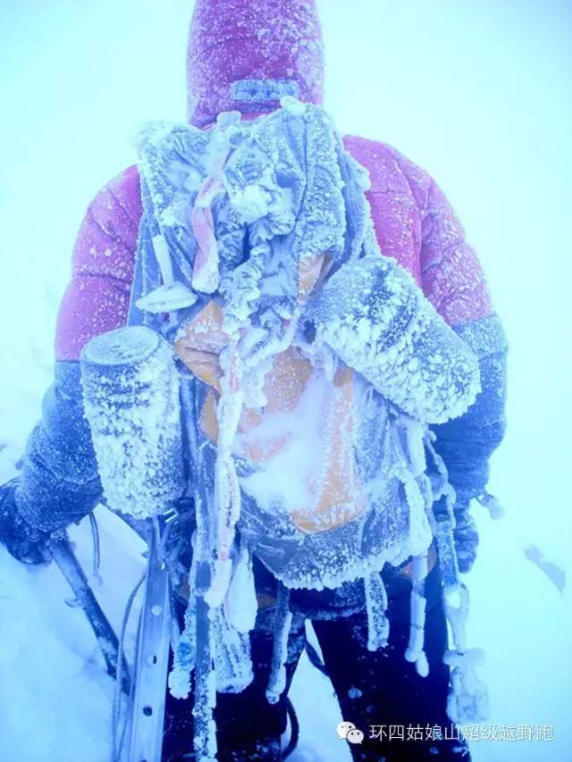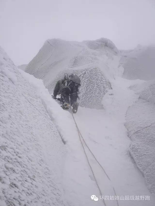 下降的时候我们留了一个冰锥在冰塔上,快到达快乐牛仔路段的时候,暴风雪来了,还夹杂着电闪雷鸣。我背包上的登山杖成了雷电导体,我赶紧把它卸下来。我们俩则缩在刃脊下面躲避。很快闪电过去了,黑暗里我们哆嗦着通过了快乐牛仔。雪下得更大了,流雪顺着陡峭的山坡滑落很快覆盖了我们的足迹。整晚我们迷失在风雪中没有扎营,因为寒冷和海拔高度让我们没办法停下来寻找营地。我们想找存储了装备的另一处悬崖,可无边的黑暗轻易地吞没了头灯昏暗的光芒。