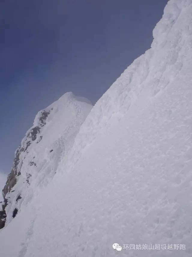 黎明终于来临了,可我们还是看不清自己的位置,因为厚厚的云层仍遮挡着刃脊。最后终于有一阵风把云撕开了一道口子,我们才看见我俩整晚都待在冰原上方300米的斜坡上,冰原就是我们的C5营地。又累又饿之中挖出留存的物资,并开始沿着上千米的北壁下撤。雪下了一整夜,足有20厘米厚。要是我们没登顶的话,留在第二天再登顶就非常不安全了。我们的岩石装备不多,15米的五毫米绳子,开始了每个人一次30米的下降。下降过程持续了九小时,我们设置了单一锚点,还不时滑到湿雪堆里去。黄昏时分我们下到了四姑娘北壁冰川,那是20年前日本队大本营的所在地。我们决心要在晚上到达大本营,因为湿雪之中将近30个绳距的下降,我们浑身已经湿透了。我们收好绳子,脱掉穿在身上九天的装备,戴好头灯,再把水壶装满,要知道我们已经又过了一个只有一升水的36小时了。