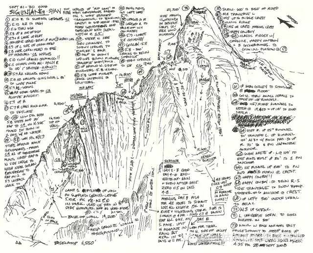 我们起得很早,爬到冰塔上面的雪坡上开始向左横切,在冰雪覆盖的岩石上爬一个接一个难度级别达到M5的路线。先是我在刃脊上领攀,这种爬法很像在阿拉斯加的攀登。岩石情况很好,冰雪也很稳定。我们在刃脊上时,经常遇到那种所谓的“快乐牛仔”式的路线。“快乐牛仔”路线就是指腿要在刃脊的两边走,骑着刃脊就像在骑着马的牛仔一样。牛仔路线指引着我们到达冰原,我们在海拔5500米处建了C7营地。为了搭帐篷我们在雪地上整理出一个平台,并用岩钉固定在岩石上。我们在帐篷里仔细研究了剩余食品和燃料。我们还有两顿饭和15个能量棒,但是只剩一个气罐刚好够登顶,之后需要饿着肚子下降。