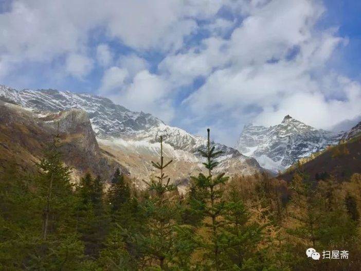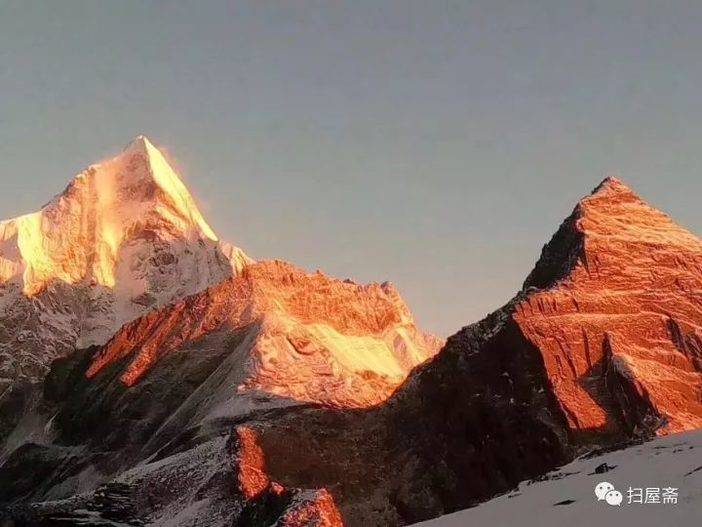 整个海子沟尽收眼底。从沟底往上,黛蓝色的山峦、苍绿色的森林、撒上泾渭分明的积雪,磅礴绵延而去。四姑娘山,四位美女的姑娘,沐浴这晨光,静静的矗立,静静地望着我。特别是幺妹妹,身姿曼妙,洁白无瑕,晨曦照耀,金光炸裂。尖尖之上,有层云雾萦绕,仿佛四妹妹的绝美面纱。源源不雾气,从沟底升起,仿佛什么在燃烧。那一定是圣洁的福气,腾达天路,直逼云霄。那种淡雅的壮观,那种柔软的震撼,让你不得不赞美这大自然所昭示给人类什么是生命最本真的真谛:安宁,静谧,蓬勃而充满无限生机。